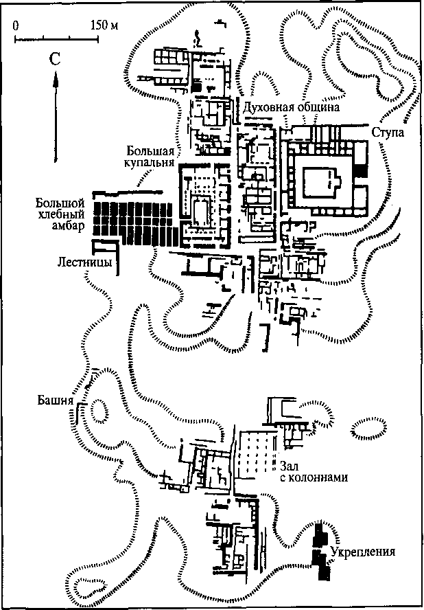 Другое сооружение, по-видимому дворец или зал для собраний, занимает площадь 70 х 23 м. Наконец, в Мохенджо-Даро, как и в Хараппе, были обнаружены огромные хлебные амбары, свидетельствующие о размерах урожая, получаемого с богатых аллювиальных почв в долинах. В Хараппе зерновой склад находился снаружи цитадели: он сооружен на платформе, расположенной по соседству с Рави, и, возможно, туда непосредственно сгружалось зерно, привозимое на судах.