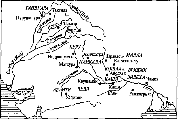 Главные очаги цивилизации переместились на восток, и теперь уже вместо унаследованного от предков «поля Куру» предстали четыре больших государства. Это были царства Кошала и Магадха, расположенные по обеим сторонам среднего Ганга, и Ватса и Аванти – в южном течении Ганга. Мы очень хорошо информированы о Кошале и Магадхе, которые стали центром распространения учения Будды и Махавиры, основателя джайнизма. Кошала, родина легендарного Рамы, шла уже к своему упадку. Ее царь, Пра-сенаджит, слабый правитель, если верить некоторым упоминаниям священных буддийских книг, проводил свое время в обществе святых мужей, в то время как его государство, наводненное разбойниками, находилось в руках племенных вождей и вассалов.