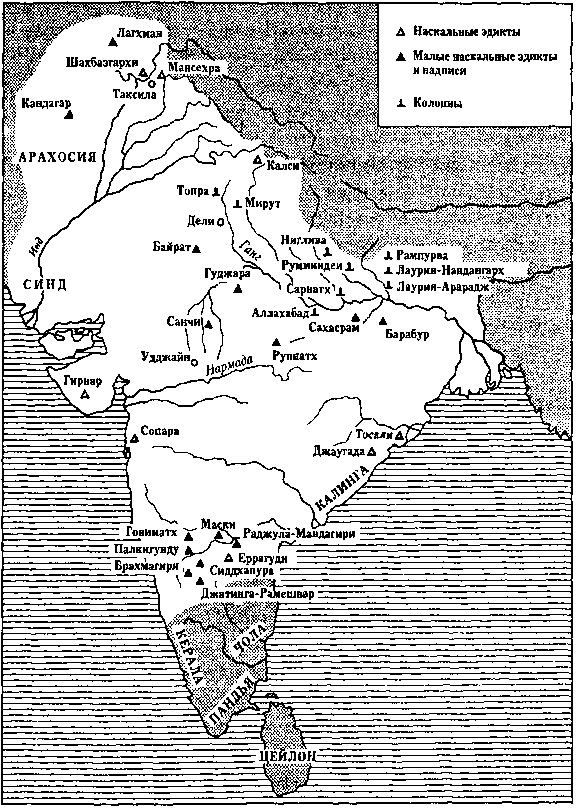 Согласно буддийским источникам, Ашока захватил трон, устранив всех потенциальных соперников, и начал свое правление с тирании, но эта версия не подтверждается надписями самого Ашоки, которые являются древнейшими из дошедших до нас письменными документами исторического характера. Речь идет о серии эдиктов, вырезанных на скалах и колоннах, расположенных далеко друг от друга по всему индийскому полуострову, совокупность которых составляет единственный памятник великому правителю. Эти эдикты, моделью для которых, возможно, послужили надписи ахеменидского царя Дария, отличаются от них содержанием: персидские источники отмечают подвиги царя царей, представляют список его завоеваний и перечисляют народы и племена, над которыми он царил, – эдикты Ашоки предстают как заявления политического порядка, как инструкции служащим и подданным. Они зачастую субъективны, и их текст, вероятно, был составлен самим императором.