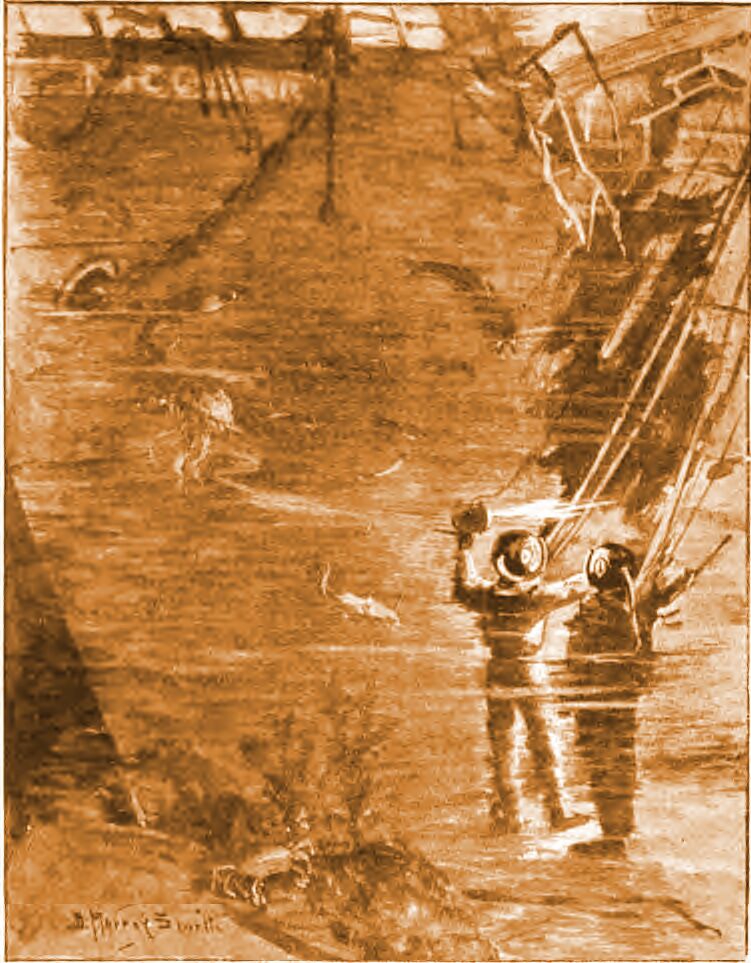 Сыщики вернулись на верхнюю палубу, и Хьюитт, прислонившись шлему своего спутника, сказал ему, что собирается совершить короткую вылазку в океан. Он снова ухватился за трап за бортом, а Меррик последовал за ним.