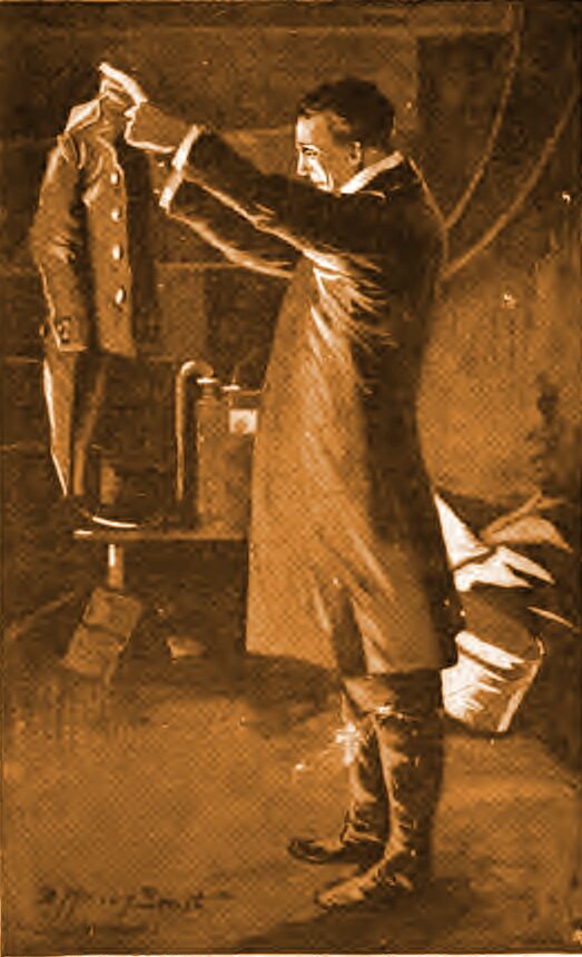 Девушка удалилась в дальний конец холла и, не сводя глаз с Мартина Хьюитта, передала его сообщение какому-то невидимому человеку в задней комнате, откуда последовал рычащий ответ: «Хорошо». Хьюитт прошел за девушкой в подвал, делая вид, что смотрит прямо перед собой. На самом деле Мартин старался заметить каждую деталь. Газовый счетчик находился в очень большой деревянной кладовке под кухонной лестницей. Девушка открыла дверь и зажгла свечу. Счетчик стоял на полу, заваленном корзинами, коробками и оберточной бумагой. Но внимание Хьюитта сразу привлекла одежда из какой-то ярко-синей ткани с большими медными пуговицами, которая валялась в углу и, казалось, была единственной незапыленной вещью в этом месте. Сыщик сделал вид, что не обратил на это никакого внимания, наклонился, торжественно постучал по счетчику три раза карандашом и внимательно прислушался, приложив ухо к нему. Затем он покачал головой и снова постучал.