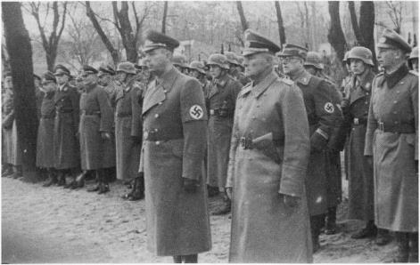 Награда убитым немецким солдатам. Впереди стоят генеральный комиссар Литвы Теодор Адриан фон Рентайн и начальник защитных полей Литвы генерал-майор Эмиль Юст. Каунас, 9 ноября 1941 года.