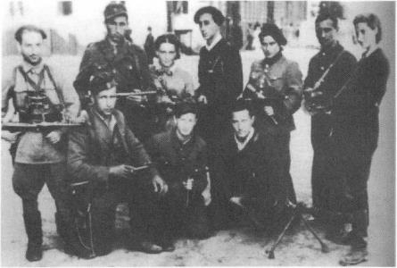 Сбежавшие из гетто евреи, сражавшиеся в советских партизанских отрядах. В первом ряду (слева, на коленях): неизвестный, Песах Мизереч, Моти Шамес; во втором ряду (слева, стоя): Эльчанан Магид, Якоб Пренер, Блюма Марковиц, Абба Ковнер, Рузка Корчак, Лейб Сапирштейн, Витка Кемпнер. Июль 1944 года.