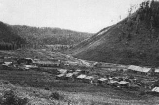Панорама поселения, основанного депортированными лицами Большого Унгута в предгорьях Саджана. Маносский район, Красноярский край, 1950-е годы.