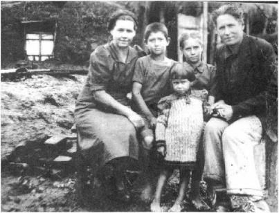 У себя дома сидят депортированные в 1941 году учительницы Элеонора Станявичене и Раполас Станявичюс со своим сыном Саулюсом Станявичюсом, дочерьми Ниоле Региной Станевичюте и Юрате Станевичюте. Черемшанка, Алтайский край, 1946 год.