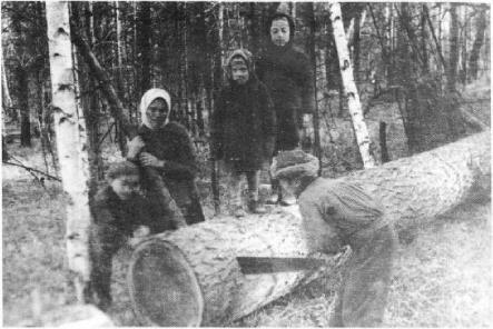 Первая зима в изгнании: 10-летний Йонас Яниселис и 12-летний Альгис Яниселис помогают своей матери Матильде Яниселене заготавливать дрова. На стволе дерева стоят Эмилия и Альдона Яниселите. Зима, Иркутская область, 1949 год.