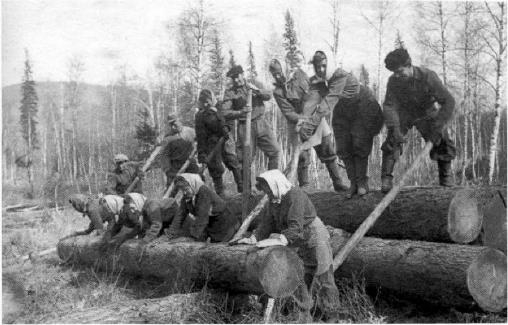 Бригада депортированных, катящих бревна к реке. Хабайдак, Партизанский район, Красноярский край, 1950-е годы.