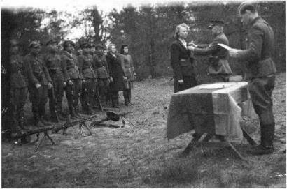 На собрании партизан группы GDL «Витаутас». Командующий военным округом Адольфас Раманаускас (псевдоним Ванагас) вручает ленту за Отвагу Софии Буденайте (псевдоним Рамуне). Адъютант штаба округа Лионгинас Балюкявичюс (псевдоним Дзукас) зачитывает приказ командования.