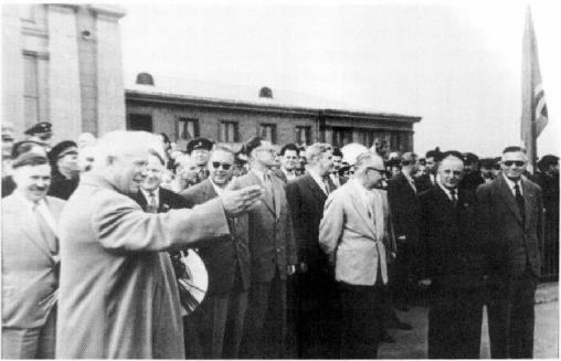 Никита Хрущев в аэропорту Риги. Антанас Снечкус слева. 9 июня 1959.