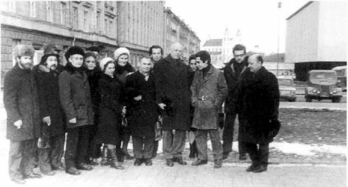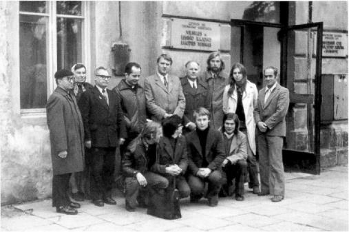 Литовские и российские диссиденты сфотографированы в день суда над Сергеем Ковалевым, известным борцом за права человека и демократию в Советском Союзе. Вильнюс, декабрь 1975 года. Слева направо: третий – Юрий Гольфенд, четвертый – Юрий Орлов, пятый – Гема Станелите, седьмой – Мечисловас Юревичюс, восьмой – Март Никиус, девятый – Андрей Сахаров, одиннадцатый – Ефрем Янкелевич, двенадцатый – Эйтан Финкельштейн, тринадцатый – Юозас Шилейкис.