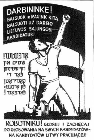 Агитационный плакат для выборов в Народный Сейм Лил Хуании. Надписи на плакате сделаны на литовском, еврейском и польском языках. Каунас, июль 1940 года.