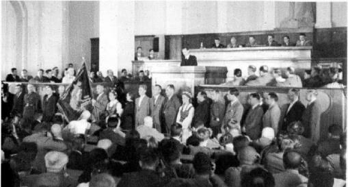 Делегация Народной армии Литвы приветствует депутатов Народного сейма. Каунас, Государственный театр. 22 июля 1940 года.