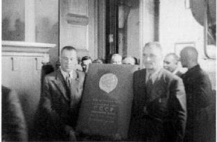 Коммунисты Литвы Мотиеюс Шумаускас и Каролис Диджиулис несут книгу заявлений. 3 августа 1940 года.