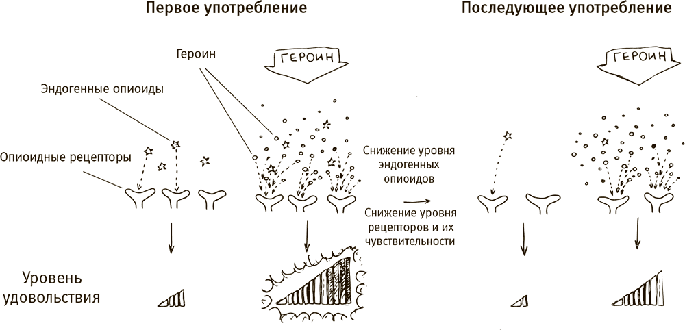 В норме, мозг обеспечивает нас небольшим количеством эндогенных опиоидов, которые, связываясь с рецепторами в нейронах, вызывают удовольствие и снижают чувствительность к боли тогда, когда это необходимо. Героин и другие опиаты связываются с теми же рецепторами и вызывают тот же эффект, но многократно усиленный. Мозг регистрирует, что сигнал от рецепторов превысил норму, и реагирует снижением производства эндогенных опиоидов, а также снижением количества и чувствительности рецепторов. Это приводит к ухудшению самочувствия и настроения в отсутствие героина. Кроме того, при последующем введении того же количества наркотика его эффект снижается, вызывая желание повысить дозу.