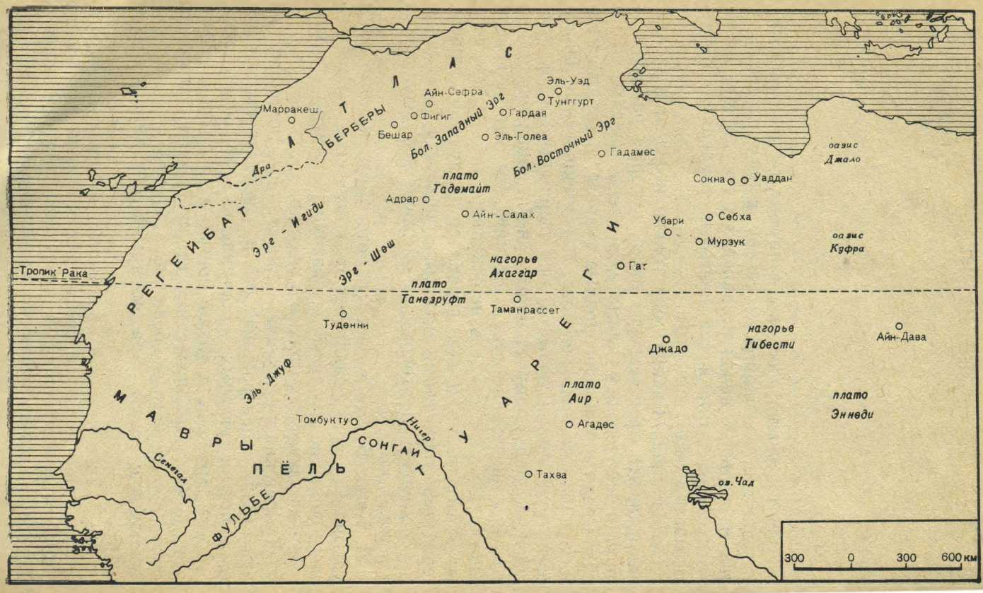 Слово Сахара вызывает в нашем воображении образ знойной пустыни, огромного песчаного океана, и чувство неутолимой жажды. А между тем из кабины самолета взору открываются высохшие долины, глубокими ущельями прорезавшие высокогорные плато и избороздившие равнины причудливым переплетением извилин, – одним словом, настоящая гидрографическая сеть, которой не хватает только воды.