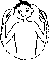 Рис. 2.1. Энергетический шар между ладонями целителя, разделенный вертикальной плоскостью на правое и левое полушария, энергию которых целитель затем распределяет вокруг своих кистей.