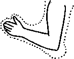 Для того, чтобы «одеть» предплечья и локти, нужно совершить аналогичное действие, но вначале соединить не только ладони, но и внутренние, ладонные поверхности предплечий и, потерев одно о другое, слегка развести ладони и локти в стороны, вообразив и затем ощутив энергетическое поле между предплечьями, – оно раздвинет их в стороны, после чего образовавшийся шар (рис. 2.3) следует тоже разделить сагиттальной (вертикальной) плоскостью на два и энергию полушарий распределить вокруг ладоней, предплечий и локтей, сделав вокруг локтевых суставов утолщения в виде шаров (рис. 2.4).
