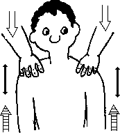Пример. Клиент сидит на полу, скрестив ноги перед собой, или, если это положение для него неудобно, вытянув их вперед. Массажист стоит на коленях или обычным образом за его спиной, положив руки на плечевые суставы, и нажимает на них в направлении к полу. Клиент медленно поднимает плечи вверх, стараясь коснуться ими своих ушей, а затем так же медленно опускает их вниз (рис. 2.10). При подъеме плеч массажист нажимает на плечевые суставы посильнее и мыслит восходящий поток, при спуске плеч нажим вниз ослабляется, но не до нуля, а массажист сосредотачивается на трансляции нисходящего потока. В заключение клиент опускает плечи и расслабляется, а массажист кладет свои руки на надплечья клиента, примерно посередине между его шеей и плечевыми суставами, и снова сосредотачивается на нисходящем потоке.