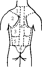 Рис. 3.1. Основные массажные области спины: 1 – надплечье; 2 – лопаточная область; 3 – подлопаточная область; 4 – околопозвоночная область; 5 – поясничная область; 6 – крестцовая область.