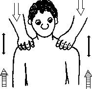 Медведь. а) Клиент садится на ковер, скрестив ноги перед собой, или, если ему так удобнее, вытянув их вперед. Массажист стоит на коленях сзади клиента, положив ему руки на плечевые суставы (рис. 3.2 а). Клиент медленно поднимает плечевые суставы вверх, стараясь достать ими до своих ушей, а затем столь же медленно опускает их до предела вниз и на секунду расслабляется, после чего снова поднимает их вверх и т. д. Массажист все это время нажимает на плечи клиента вниз: при подъеме, активизируя при этом восходящий поток, чуть сильнее, чем при спуске, когда, наоборот, активизируется нисходящий поток. Силу давления следует отрегулировать так, чтобы клиент воспринимал ее как существенную, но не чрезмерную.