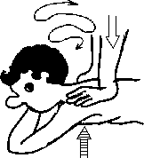 Жираф. Клиент сидит в том же положении, что и при исполнении Медведя, массажист стоит на коленях сбоку. Одна рука массажиста лежит на груди клиента, чуть ниже горла, другая – на затылке (рис. 3.3 а). Клиент с усилием пытается отклонить голову вместе с шеей назад, но массажист силой своих рук удерживает голову клиента на месте. Поддерживая усилие головой назад, клиент начинает покачивать ею вправо-влево, то есть как бы укладывать ее то на правое, то на левое плечо, и последнему движению массажист не препятствует, то есть его рука движется вместе с головой клиента, постоянно нажимая на нее с затылка. Силу нажима назад в данном случае определяет клиент, который не должен выбиваться из сил, но все же работать с ощутимой для себя нагрузкой, чтобы в конце упражнения почувствовать в задней части шеи и плеч некоторое утомление, приятное тепло и расслабление.
