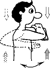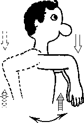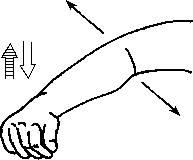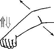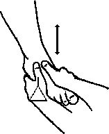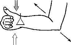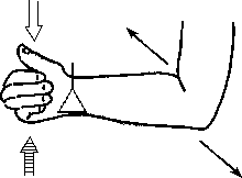 Разгрузка плечГорилла. а) Клиент сидит, согнув руку в локте под углом около 90 0, кисть сжата в массажный кулак, тыльная сторона ладони направлена вниз (рис. 4.31). Клиент пытается согнуть руку в локте, а массажист противостоит этому усилию; кроме того, клиент медленно покачивает локтем вправо-влево. Восходящий и нисходящий потоки активизируются, как обычно.