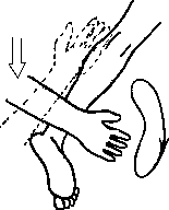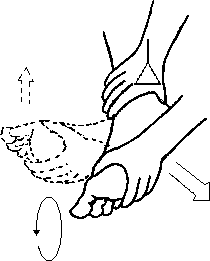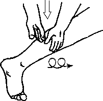 Притирание. Массажист одной рукой обхватывает голень клиента чуть выше лодыжек, а другой рукой обхватывает его стопу ближе к пятке с подошвенной стороны (рис. 5.7), после чего, с усилием сдвигая свои руки, то есть как бы вдавливая стопу клиента в голень, совершает кругообразные движения стопой, поворачивая ее относительно голени вправо, затем влево, вверх, вниз и т. д.