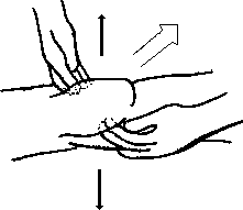 а) Массажист обхватывает одной своей ладонью ногу клиента с внутренней стороны чуть ниже коленного сустава, а другой рукой – ту же ногу, но чуть выше коленного сустава и с наружной стороны этой ноги (рис. 5.28); после этого массажист нажимает обеими руками на ногу клиента в противоположных направлениях: рука, расположенная с внутренней стороны, надавливает в направлении наружу, а внешняя рука – внутрь (оба усилия перпендикулярны бедру). Сначала массажист постепенно увеличивает силу своего нажима, активизируя восходящий поток, а затем столь же постепенно ее уменьшает, активизируя нисходящий, затем снова увеличивает и т. д.