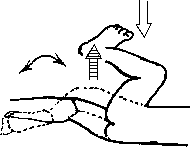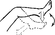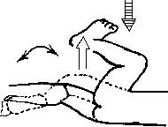 Слон. а) Клиент лежит на спине, выпрямив одну ногу, а другую согнув так, что бедро направлено вертикально вверх, а голень горизонтальна (рис. 5.33). Массажист нажимает на колено, отжимая его горизонтально в сторону от головы клиента, как бы стараясь выпрямить ногу в тазобедренном суставе. Клиент, подтягивая колено к себе, противостоит этому нажиму, но двигает коленом вправо-влево; при этом рука массажиста перемещается вместе с коленом клиента, не ослабляя нажима в сторону его пяток.