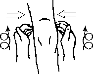 Поперечное растяжение на суставе надколенника выполняется так: клиент лежит на спине, полусогнутые пальцы рук массажиста проникают под боковые края надколенника (рис. 5.24), слегка оттягивая его от бедра вверх, после чего немного сдвигают оттянутый надколенник вправо-влево.