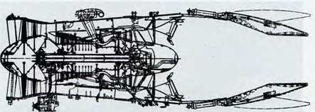 Рассмотрим некоторые особенности компоновки и конструкции самолета В-1 (В-1 А). Общая схема – «нормальная» интегральная, с крылом изменяемой стреловидности, с четырьмя ТРДДФ, размещенными попарно в мотогондолах за центропланной частъю интегральной части фюзеляж-крыло.