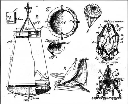 Свои парашюты в России имелись – ранцевые, системы Г.Е. Котельникова. Их изготовили, несколько десятков штук, для экипажей самолетов «Илья Муромец» Сикорского. Но пилоты с подозрением и опаской смотрели на металлические ранцы. Тогда их передали в воздухоплавательные части, для привязных аэростатов.