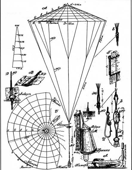 Как же был устроен этот парашют? Шелковый купол его имел довольно большую площадь, равную 85 м². Стропы (плетеные льняные шнуры) соединялись внизу в одну общую петлю. К ней была прикреплена прочная веревка длиной более трех метров, оканчивавшаяся карабином. Последним веревка пристегивалась к «помочам», надетым на воздухоплавателе.