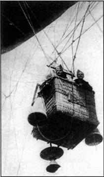 Наблюдатели в корзине привязного аэростата. У борта висят чехлы с парашютом Жюкмеса