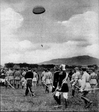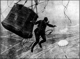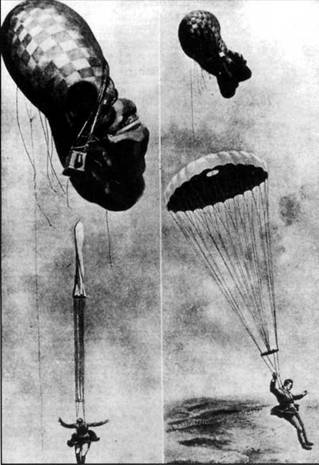 А вскоре наступил черед и первому вынужденному прыжку в боевых условиях. Произошло это 29 мая 1917 г. на Юго-Западном фронте, в 25-м армейском воздухоплавательном отряде. Наблюдатель, прапорщик Полторацкий, на высоте 700 м выпрыгнул из подожженного аэростата и, благодаря парашюту, остался жив, получив, правда, легкие ранения во время приземления.