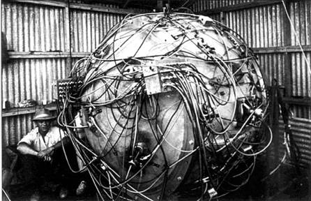 Верхняя площадка полигона в Аламогоро. «Изделие» собрано в процессе подготовки к испытаниям. Сидит – лейтенант-коммандер Норис Бредбери – руководитель группы по сборке неядерных компонентов бомбы