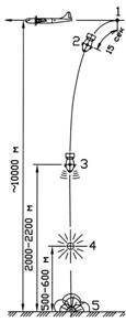 1 – сброс бомбы; 2 – включение автоматики подрыва; 3 – включение радиовысотомера; 4 – подрыв заряда от радиовысотомера; 5 – самоликвидация бомбы от ударных взрывателей.