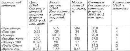 Представляют интерес данные о стоимости беспилотного авиационного комплекса. У современных американских БПЛА стоимость 1 кг массы планера составляет 3300 долл., а стоимость 1 кг целевой нагрузки – 17260 долл. Данные о стоимостных характеристиках некоторых комплексов приведены в табл. 3.