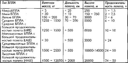 Все многообразие созданных и разрабатываемых беспилотных аппаратов можно классифицировать по взлетной массе, дальности, высоте и продолжительности полета (табл. 5), а также по типу конструкции и силовой установки.