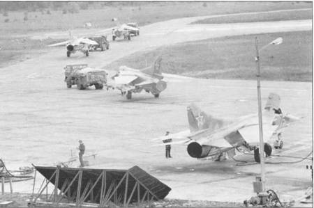 День полетов на аэродроме Смуравьево. После полетов МиГи буксируются в укрытие. В качестве тягачей используется «подручный» автотранспорт, включая АПА, УПГ и топливозаправщики