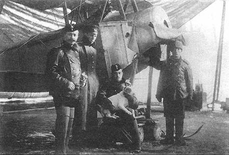Лётчики 7-го аои в палатке у «Ньюпора»-10 весна 1917 г. Слева направо: подпоручик Бычков (или Янченко), поручик Макиёнок и корнет Гильшер с собакой на коленях, неизвестный.