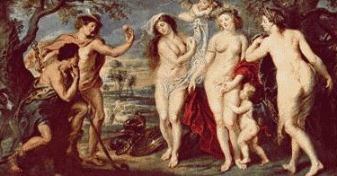 Многие источники мифа, а также поздние интерпретации, рисуют ситуацию как произошедшую мгновенно. Божественный глас персонифицируется в фигуре Гермеса, слетевшего с Олимпа, и Париса прямо-таки чуть ли не разбудившего. За плечо трясет, золотое яблоко в физиономию тычет, а тут же, прямо за гермесовой спиной, три богини раздеваются перед обалдевшим пастухом-царевичем. Глаза протереть еще не успел, а три роскошные красавицы уже напирают, грудями толкают, очами вращают, бедрами поводят, по плечам власы струятся, и верещат они, бог мой: «Мне, мне, мне дай, мне, прекраснейшей, давай, я тебе и то, и другое, и третье сделаю, дай только мне, мне одной, единственной и несравненной».