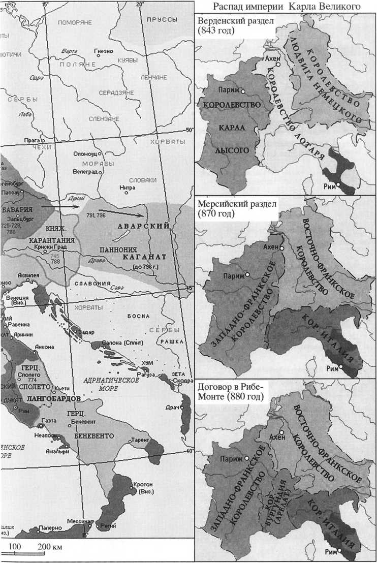 Трехлетие после смерти Людовика Благочестивого в 840 г. вошло в историю как «распря» или «война между братьями». Итогом ее стал фактический раздел Франкского государства. По Верденскому договору 843 г. Карлу Лысому отошли земли, позже ставшие средневековой Францией (Западно-Франкское королевство), Людовику достались владения в Германии (Восточно-Франкское королевство), между ними лежал удел их старшего брата Лотаря – в его руках находился Рим на юге и Ахен на севере. Лотарь сохранял старшинство, данное ему императорским титулом, однако на практике Верденский раздел означал конец единой Франкской империи. Она ненадолго пережила своих создателей. Зато политические структуры, возникшие в результате Верденского раздела, закрепились на политической карте Европы, очевидно потому, что приблизились к социальной и культурной реальности своих регионов. Важным памятником признания таких культурных различий является сохранившийся текст Страсбургской клятвы. Когда в 842 г. Карл Лысый и Людовик Немецкий решили скрепить свой союз клятвой, первый произнес ее на французском, а второй на немецком языке.