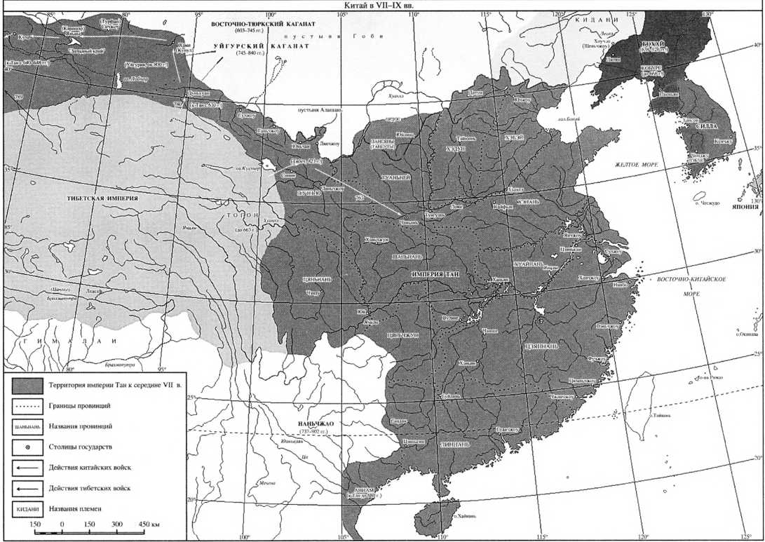 Однако в этот период интенсифицировалась торговля с зарубежными странами, что было связано с активизацией внешней политики империи. Будучи в какой-то мере обязанной своим происхождением синтезу китайских и «варварских» традиций, династия Тан, особенно на первых порах, проявляла удивительную открытость и стремление выйти за рамки привычных границ Поднебесной. К 668 г. империи удалось добиться подчинения всех трех корейских государств (см. с. 300). Еще ранее, в 630 г., под ударами китайских войск пал Восточный Тюркский каганат. Часть тюркских племен была расселена императором Тай-цзуном в пограничных районах на положении федератов. Активное использование конницы позволило императору захватывать оазисы, расположенные вдоль Великого шелкового пути, куда раньше не добиралась китайская пехота.