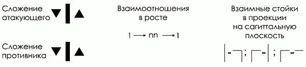 На вышестоящем уровне (после взаимных стоек в проекции на горизонтальную плоскость) учитывается рост: средний, длинный, короткий. При определении предпочтительных технических действий целесообразно ограничиваться понятиями: выше противника (l), ниже противника (n): На нижележащем уровне располагаются две равнозначные категории признаков (схема 6.4.2.1). С одной стороны, это уже знакомые стойки в проекции на сагиттальную плоскость, с другой – особенности строения тела атакующего и противника (ширина плеч, таза, длина туловища, длина ног).