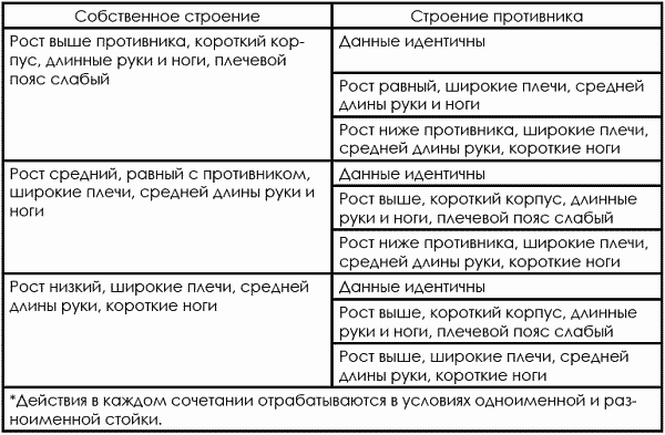 В связи с многообразием сочетаний пропорций тела бойцов и зависимостью использования боевых поз целесообразно предусмотреть на 1-м году этапа спортивного совершенствования корректировку своей индивидуальной техники и тактики в целях адаптации вначале с бойцами, использующими различные боевые позы, а затем с бойцами, имеющими различные телосложения (табл. 6.4.2.1).