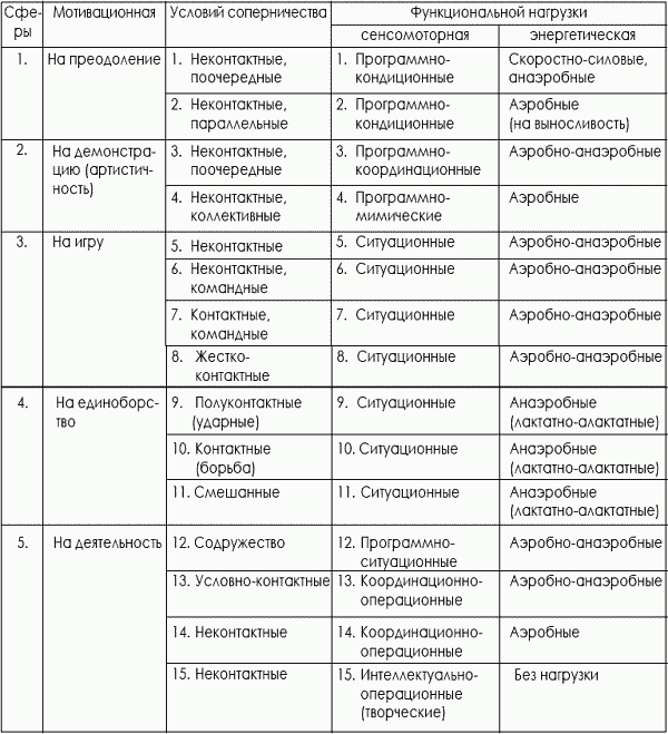 Виды деятельности человека вообще и в том числе виды физкультурно-спортивной деятельности можно разделить на 5 основных групп с подгруппами (Г. Г. Наталов, 1976; Ю. А. Шулика, 1996) (схема 1.2.1).