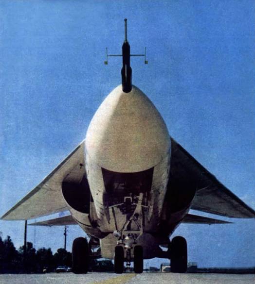 Уже первые весовые расчеты показали, что такой аэроплан потянет тонн на 50 с гаком. Между тем, самолету предстояло базироваться едва ли не на грунтовых аэродромах. Требование эксплуатации на аэродромах с короткими ВПП и способность пересекать Атлантику диктовали использование крыла умеренной стреловидности и большого размаха. Поход за 2,5 Маха, наоборот, предполагал значительный угол стреловидности крыла. Выход виделся в использовании крыла изменяемой стреловидности. Требуемую дальность должен был обеспечить двухкон– турный турбореактивный двигатель, имеющий меньший по сравнению с ТРД расход топлива. Ни подвижное крыло, ни ТРДД на серийном боевом самолете не ставил еще никто.