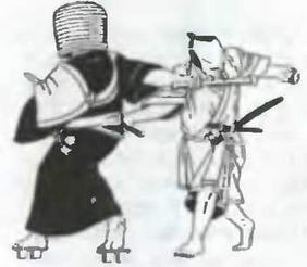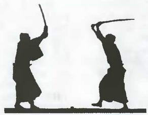 Ниндзя в одежде странствующего монаха (слева) сражается с самураем