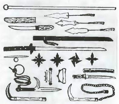 В этих убийцах ценились смекалка и хитрость. Под их руками любой предмет мог стать оружием. Кусаригама напоминала собой заостренный серп, к которому на цепи был привязан груз: эту связку ниндзя кидал во врага. На пальцы ниндзя надевал железные когти и ими наносил раны в единоборстве. Во рту прятал фукибари – трубочку, из которой, сблизившись с врагом, стрелял иголками. При себе держал бамбуковую трубку с насыпанным в нее порохом и швырял ее в лицо противника. В случае преследования бросал под ноги врагам тэцубиси – звездочку с торчавшим из нее ядовитым шипом. У женшин-ниндзя был популярен какутэ – кастет, чьи выступающие части смазывались ядом.